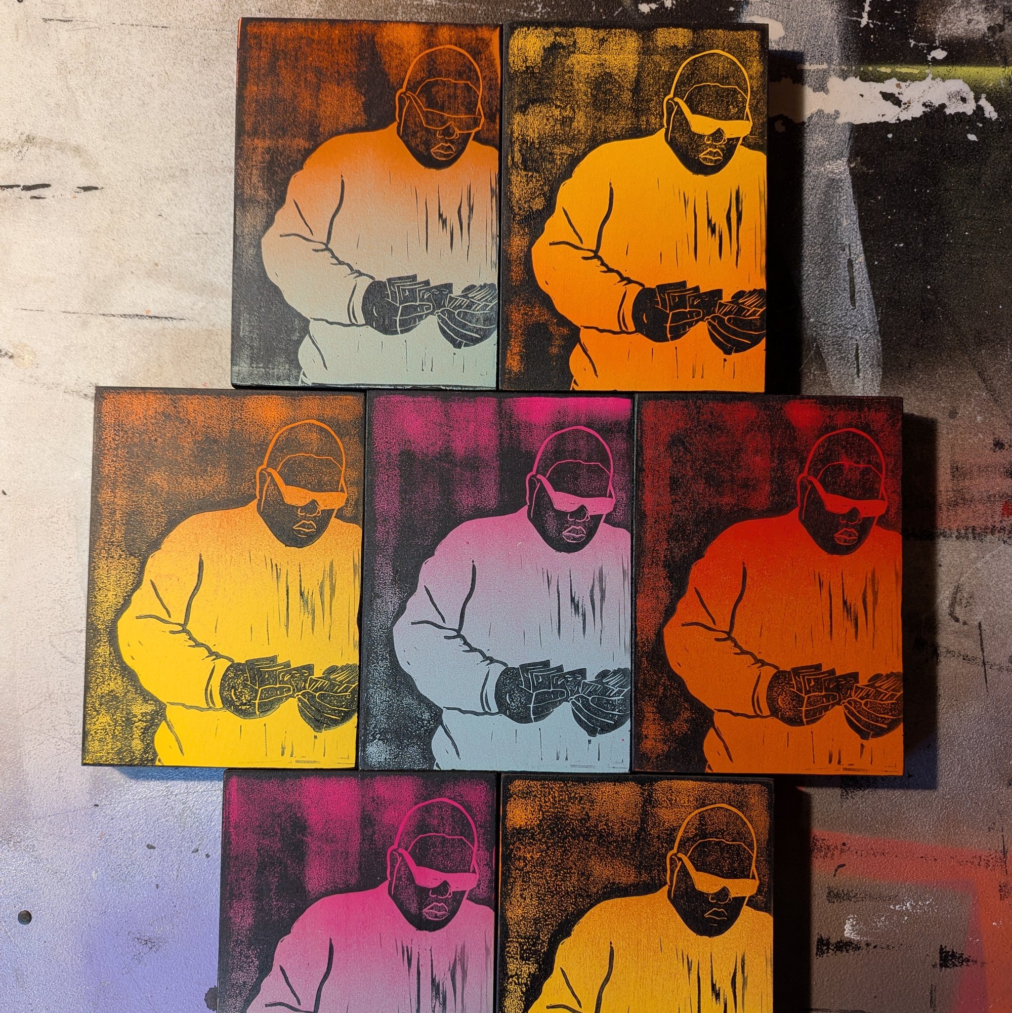 hand printed lino cut design on painted wood block. poly finished and ready to hang.
