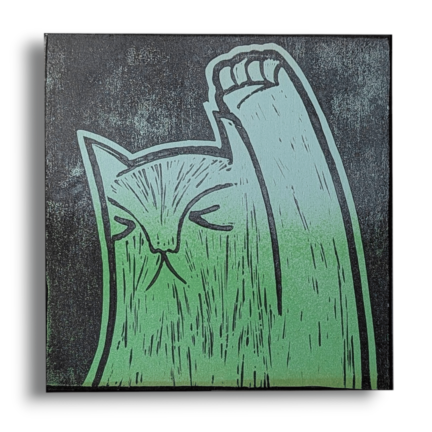 hand printed lino cut design on painted wood block. poly finished and ready to hang.